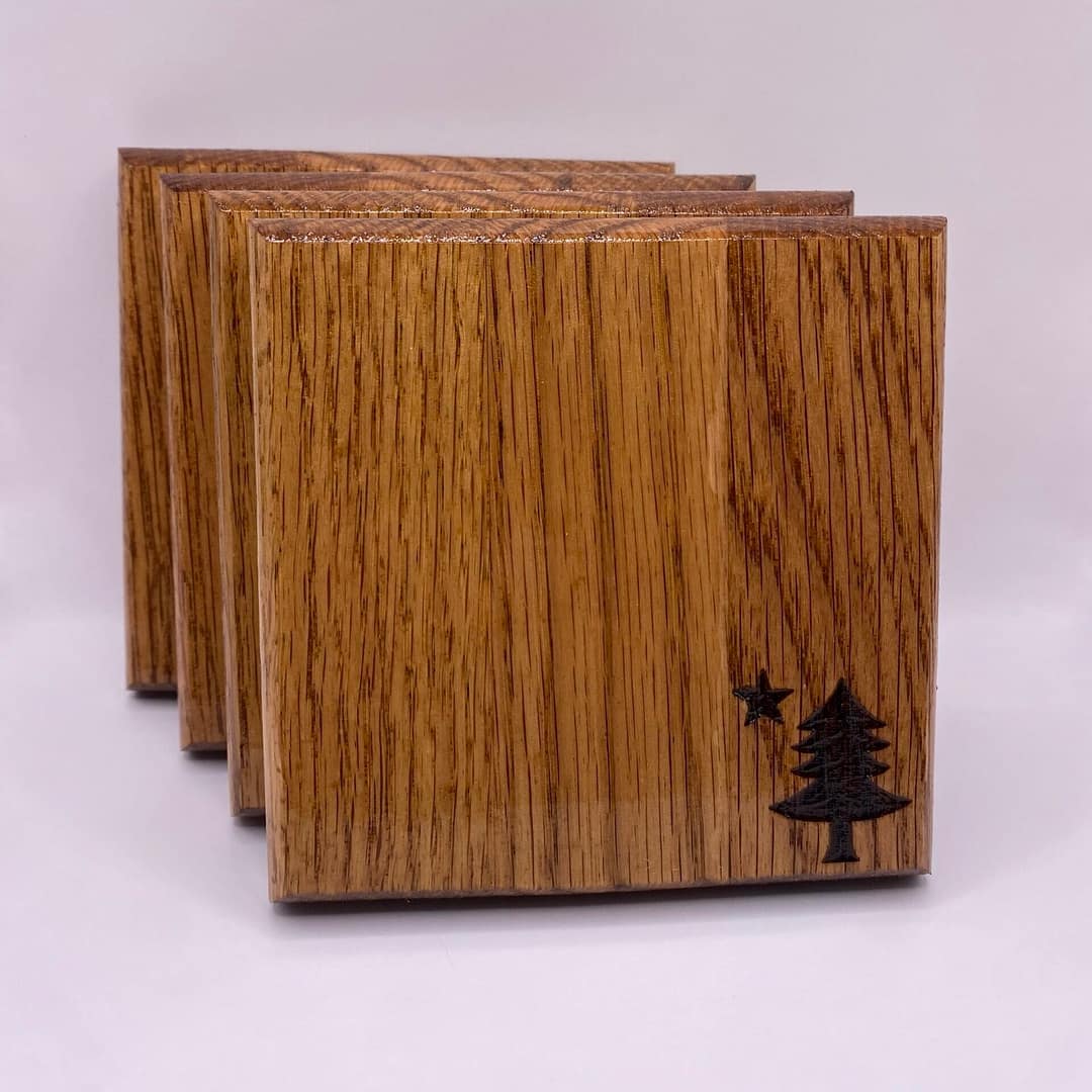 Made from solid red oak and finished by hand, these coasters are built to last while protecting your tabletops from scratches, water rings, and heat. The natural grain of the oak gives every set its own unique character, making them a great addition to your home bar, coffee table, or camp in the woods.